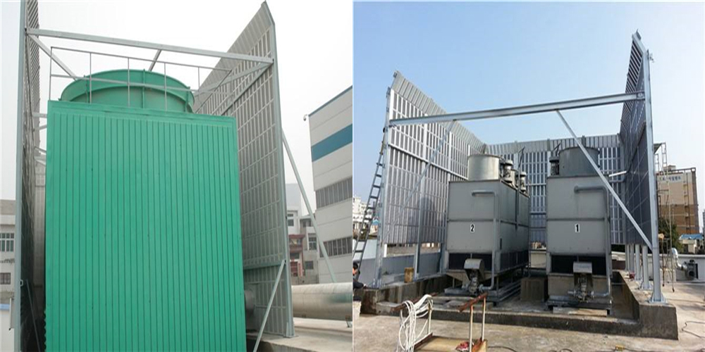 冷卻塔的聲音來源主要體現(xiàn)在頂部排風機器的風噪聲以及下層的淋水時產生的噪聲。另外的一些聲源還包括:風機的噪聲、減速機產生的噪聲、電動機發(fā)出的噪聲、冷卻塔配管及閥體的噪聲、冷卻用泵的噪聲以及機殼振動向周圍輻射所發(fā)出的噪聲。 為了使廠界噪聲值達到想要的標準,我廠建議設置隔聲屏障,由于冷卻塔隔聲屏障的高度較高,由于工程投資及抗風、抗震等因素,所以屏障采用上下兩段結構:上部分分為隔聲屏障,具有吸聲、隔聲作用;下部分為磚結構,如水泥空心磚等;地下部分為承重、扛傾覆的基礎,以混凝土和鋼材為主。